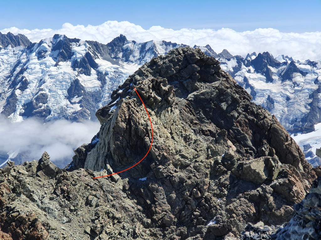 A New Zealand Southern alps classic route! Got a brief weather window in late Feb 2022 to sneak up this route. Popular with good reason – easy grade 10-12 scrambling on solid (by NZ standards) rock up to the west ridge, then a spectacular ridge traverse to the summit over the famous cheval.