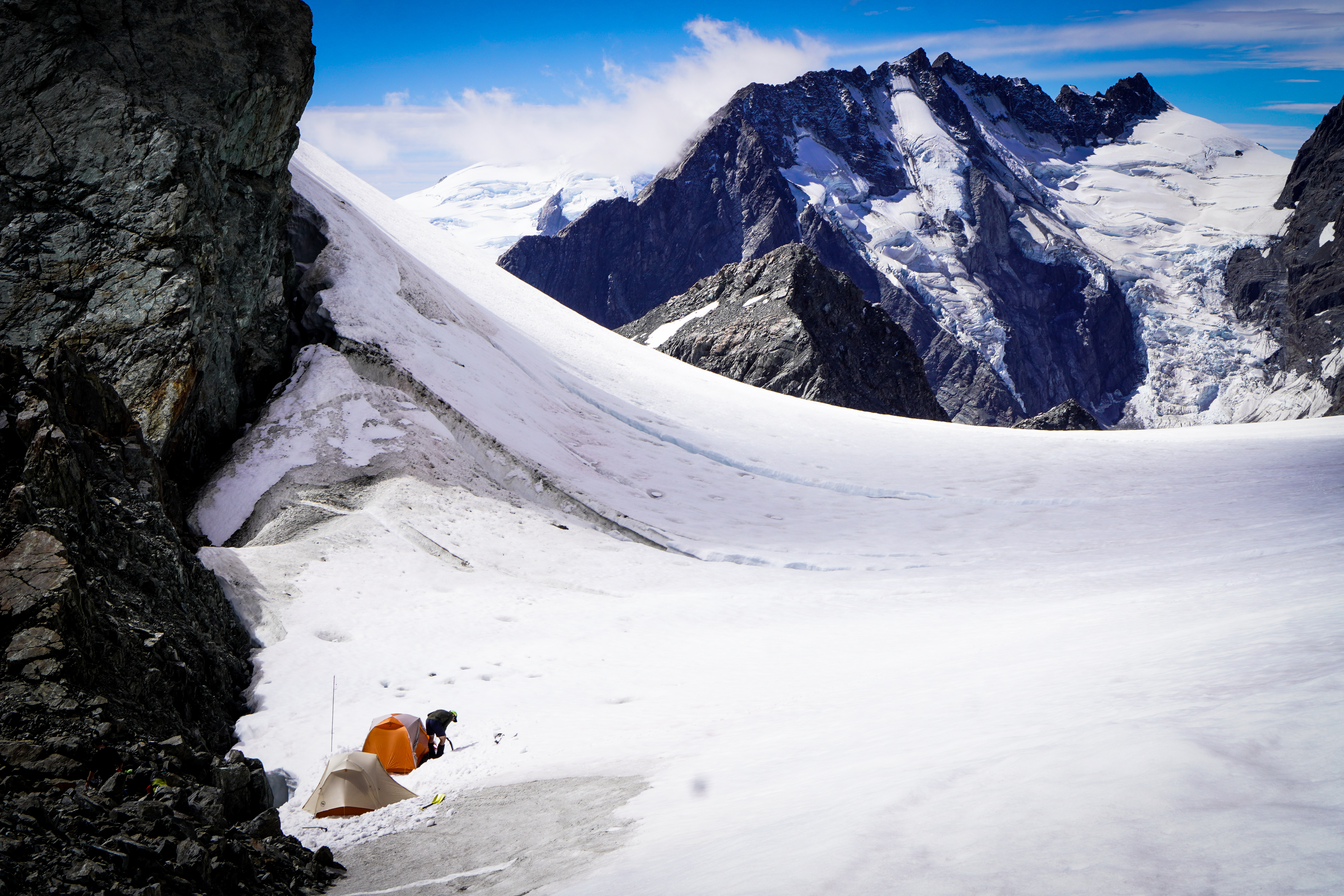 We opted to sleep on the snow just next to the ridge as we thought our inflatable airbeds wouldn’t stand up to the sharp rock. There was no water near the campsite so don’t forget the jetboil (like I did… The risk of packing straight after a night shift!). We were able to find running water across the schrund at the point marked in the photo, which saved the trip but it was a real faff and took forever. Another option would be to camp down by the lake if you don’t want to melt all your water – allow an extra 1-2 hours to get up to the start of the route.