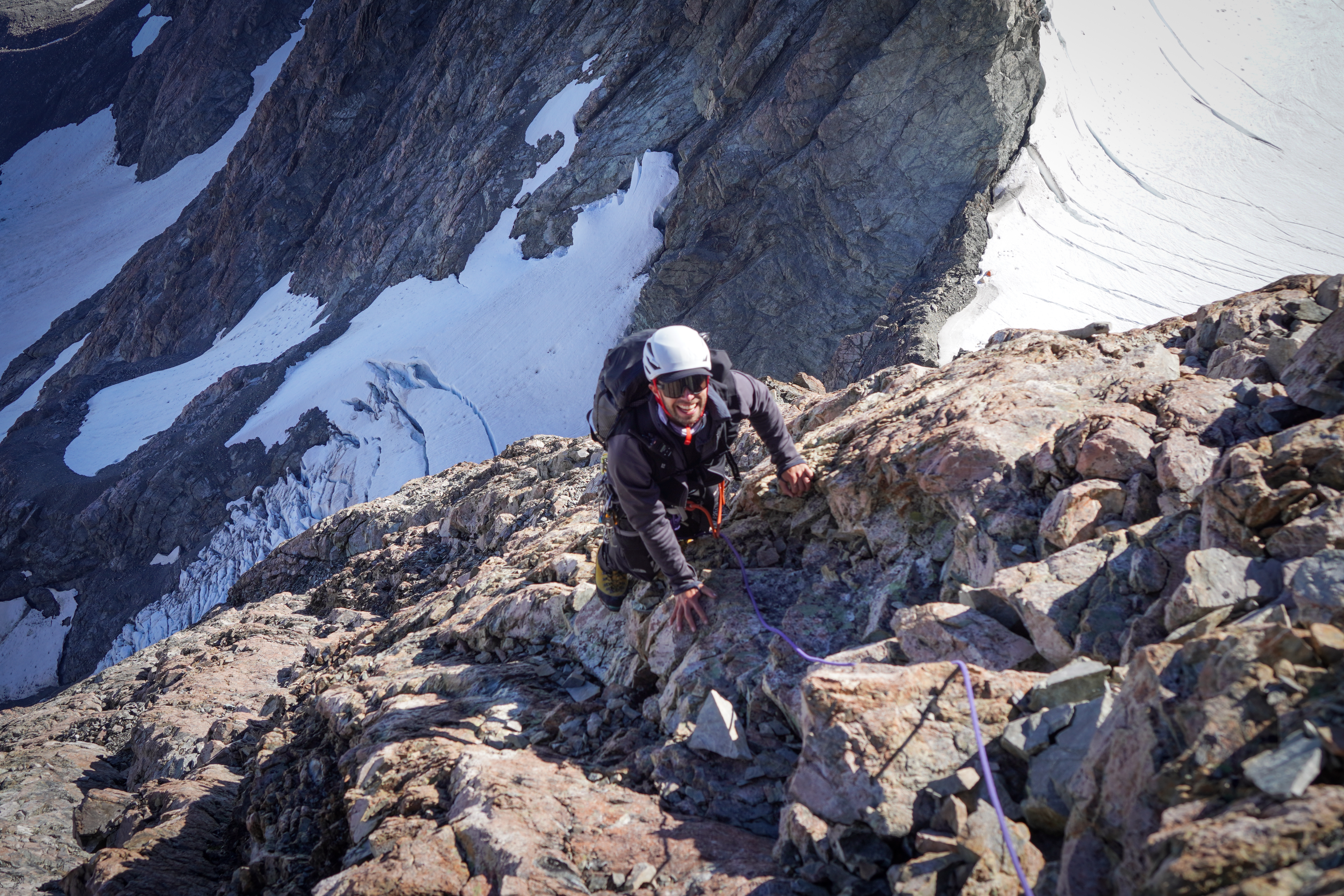 It gets easier from here up to the summit but took a surprisingly long time as we took the rope on and off a few times and needed to make 1x rap: it took us nearly 2 hours from the cheval to the summit. The route finding wasn’t super obvious at one point on the way up passing one final gendarme – we made an unnecessary rap down the south face and then climbed back up a snow field. When viewed from above you can easily turn the gendarme on the north side (see pic below!).