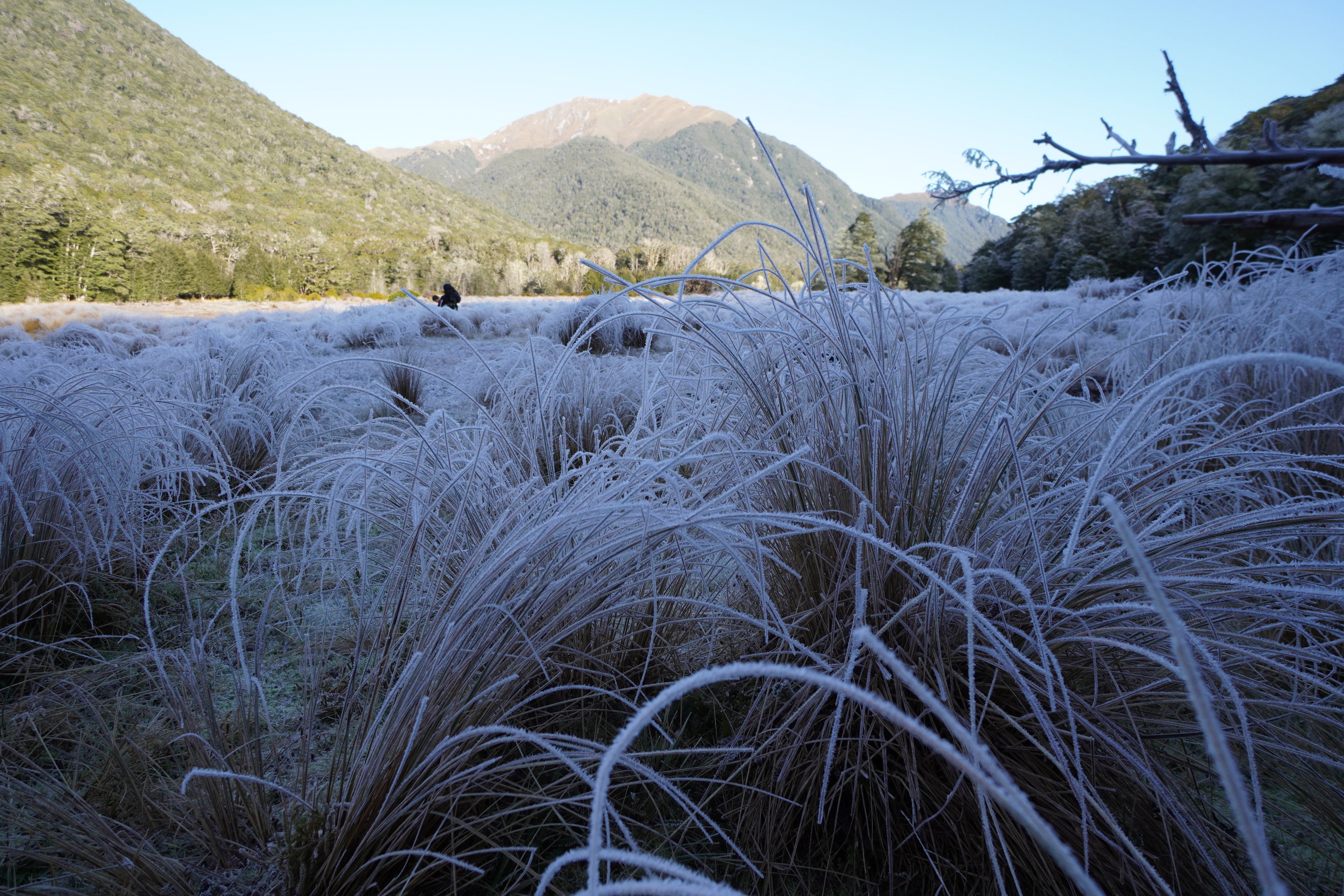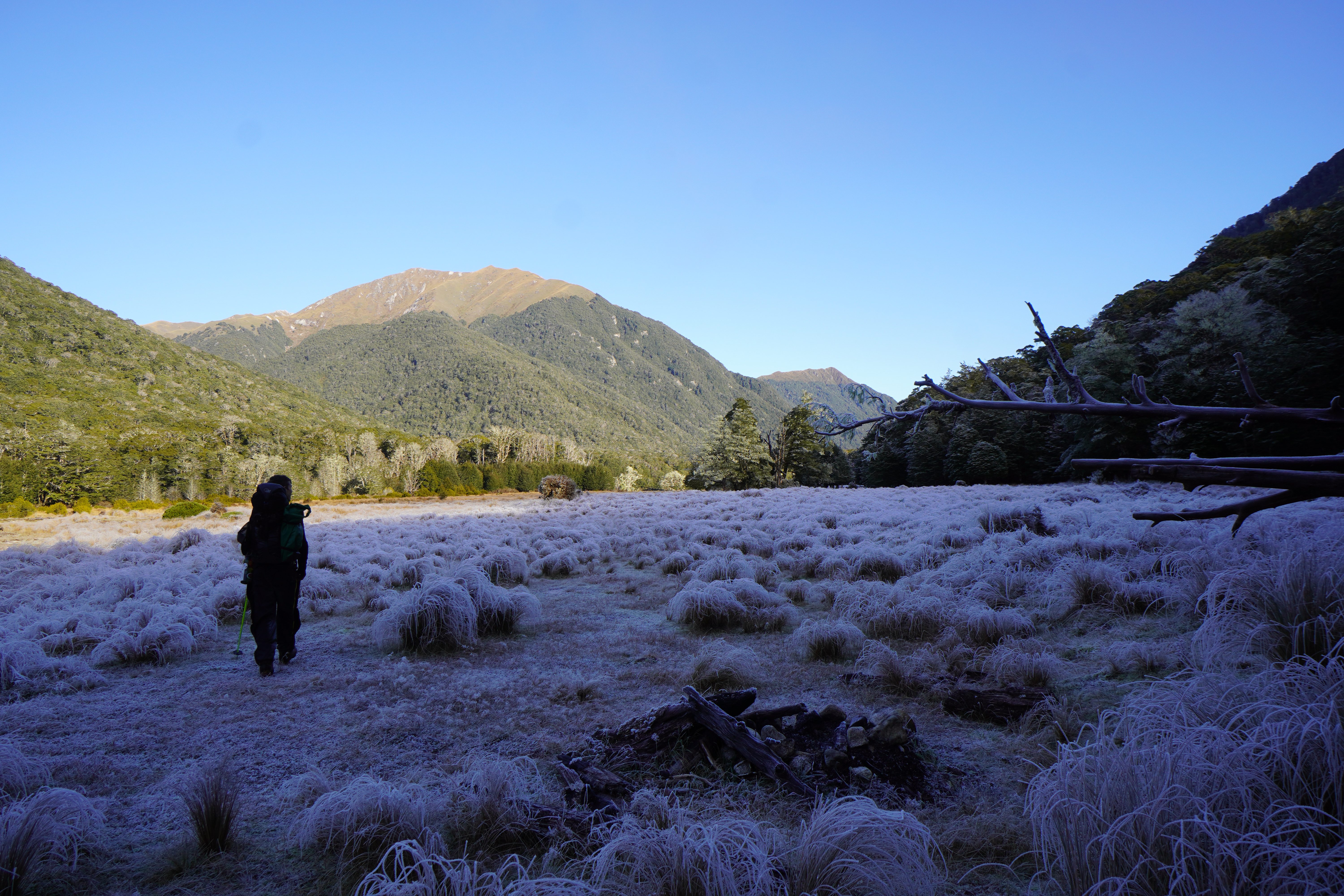 We left one car just up to road from Borland lodge. Then we drove round to Manapouri and stayed at Possum Lodge the night before – a stone’s throw away from the jetty where you start. You need to cross Waiau river to get onto the walking track. There are water taxis in the summer season but it was June and besides, it is only about 50m wide – easily doable with a packraft! Harder when there’s only one between two and heavy packs per person… Joe took one for the team and did the trip once with the bags, and the second time with me. Obviously you can use any other river worthy vessel too, as long as you’re happy to stash it somewhere discretely or just risk losing it. At the end of the trip you’ll have to retrieve whatever you left of course requiring a river swim to finish the hike! Other option is to hike with the packraft but we opted just to swim back over at the end. Just watch for passing boats… We were on the water by 0700.