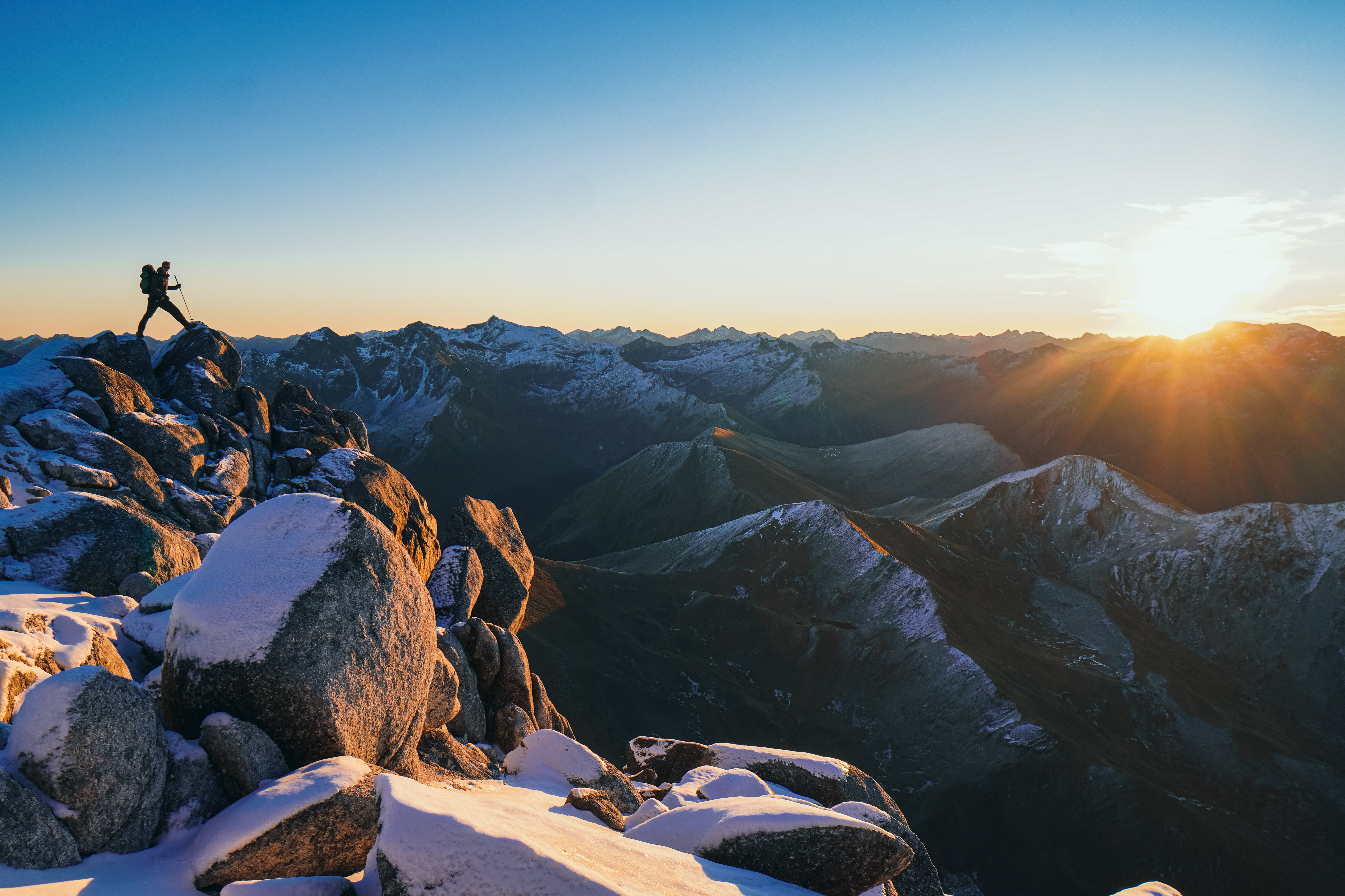 Head directly up through the bushline and stick to the ridge of Titiroa. It’s a good grunt going up to 1715m, but in total we clocked just shy of 2000m elevation in total. From the summit, soak in the panoramic views of the Fiordland surrounds! We summited just after 5pm. Smattering of snow around, lots of very oddly shaped boulders. The sun was just starting to set as we descended to find a biv spot for the night. Always love golden hour!