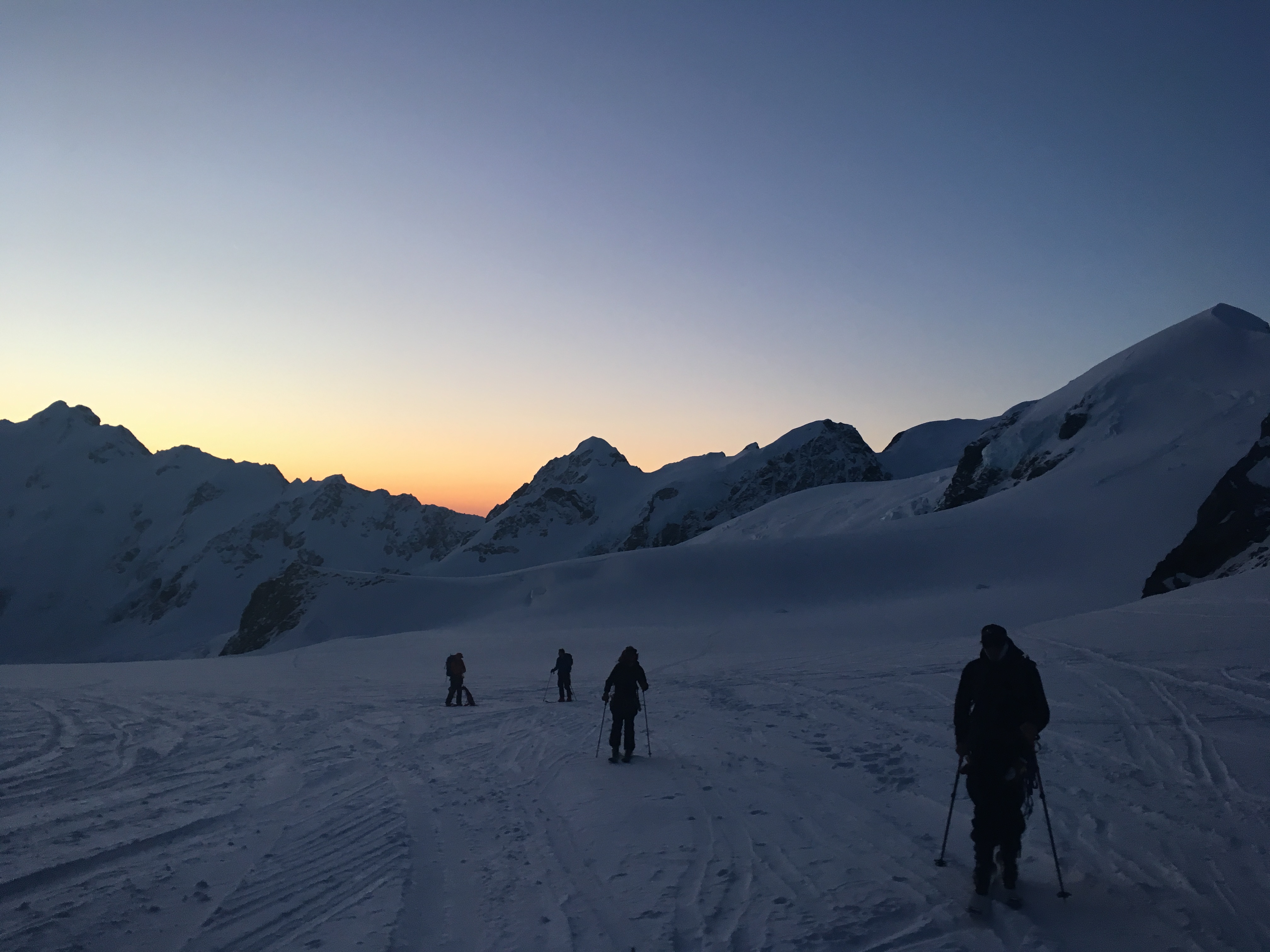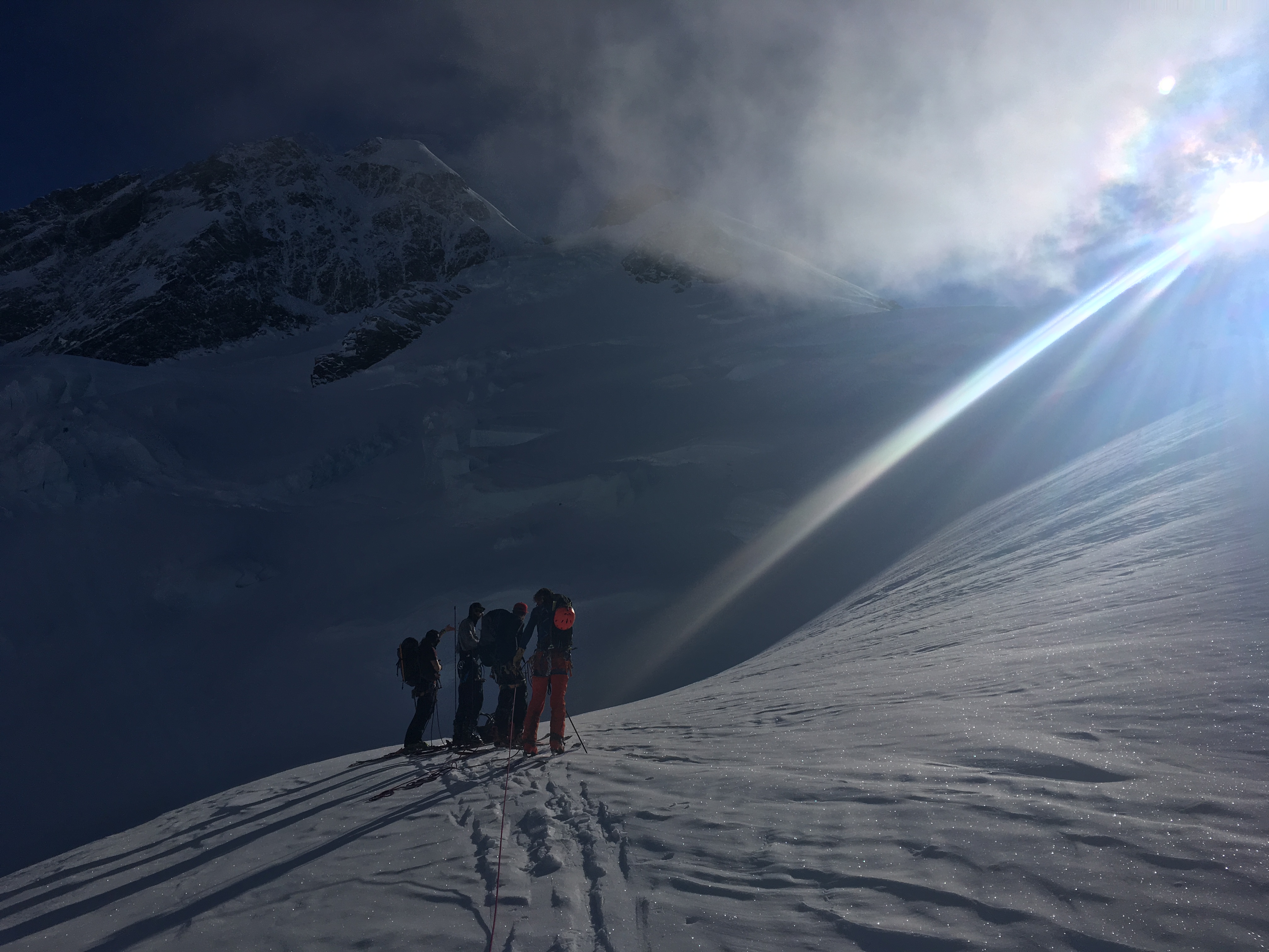 We had to cross the schrund on the far West of the face as it opened up significantly to the East. But the West side was bare ice so we traversed across the rock band to hit the good snow on the East side. We hit the summit ridge about 50m East of the summit, then cruised up the low angle slopes to the top.