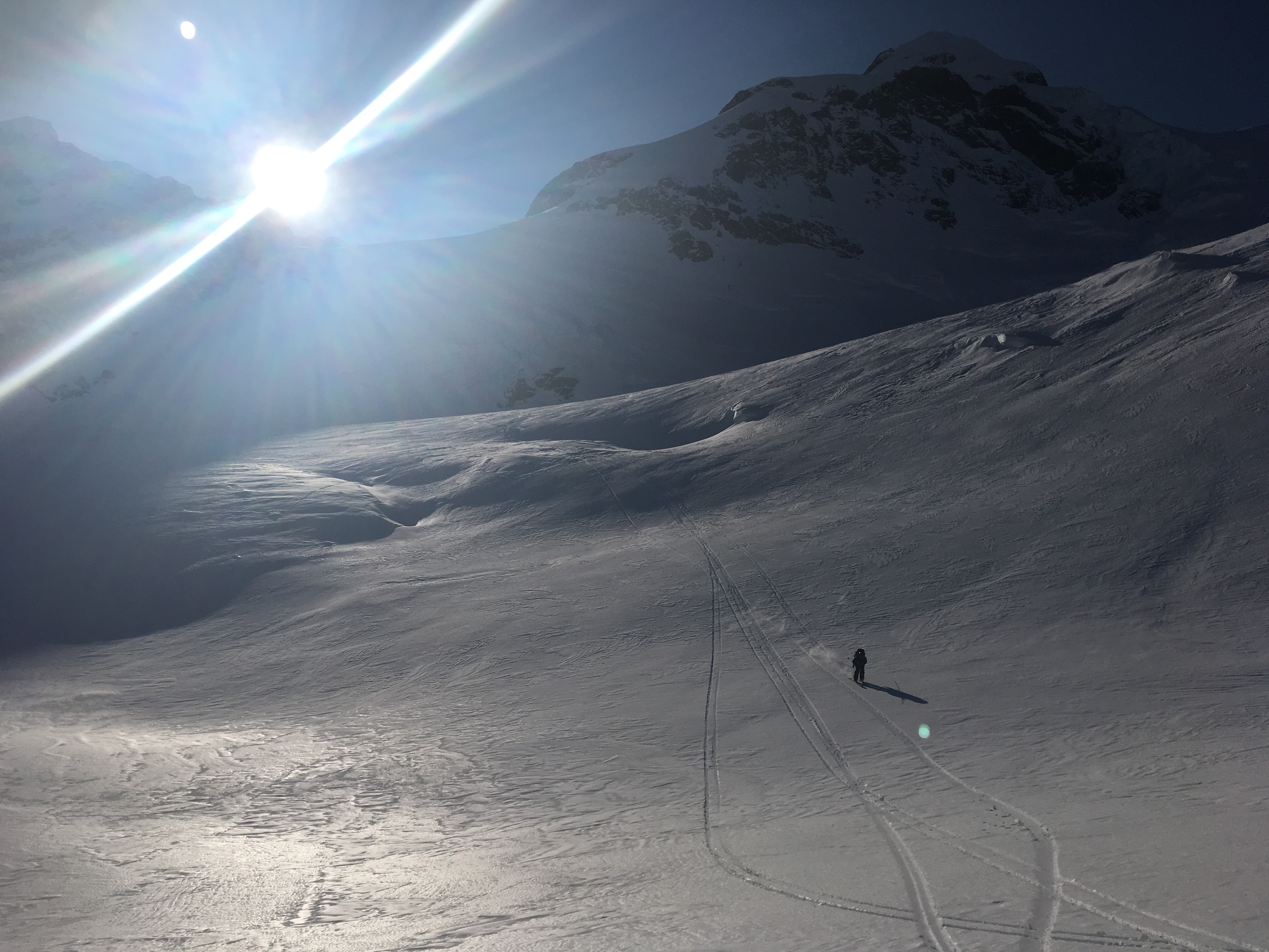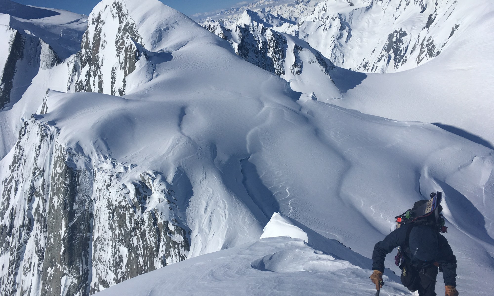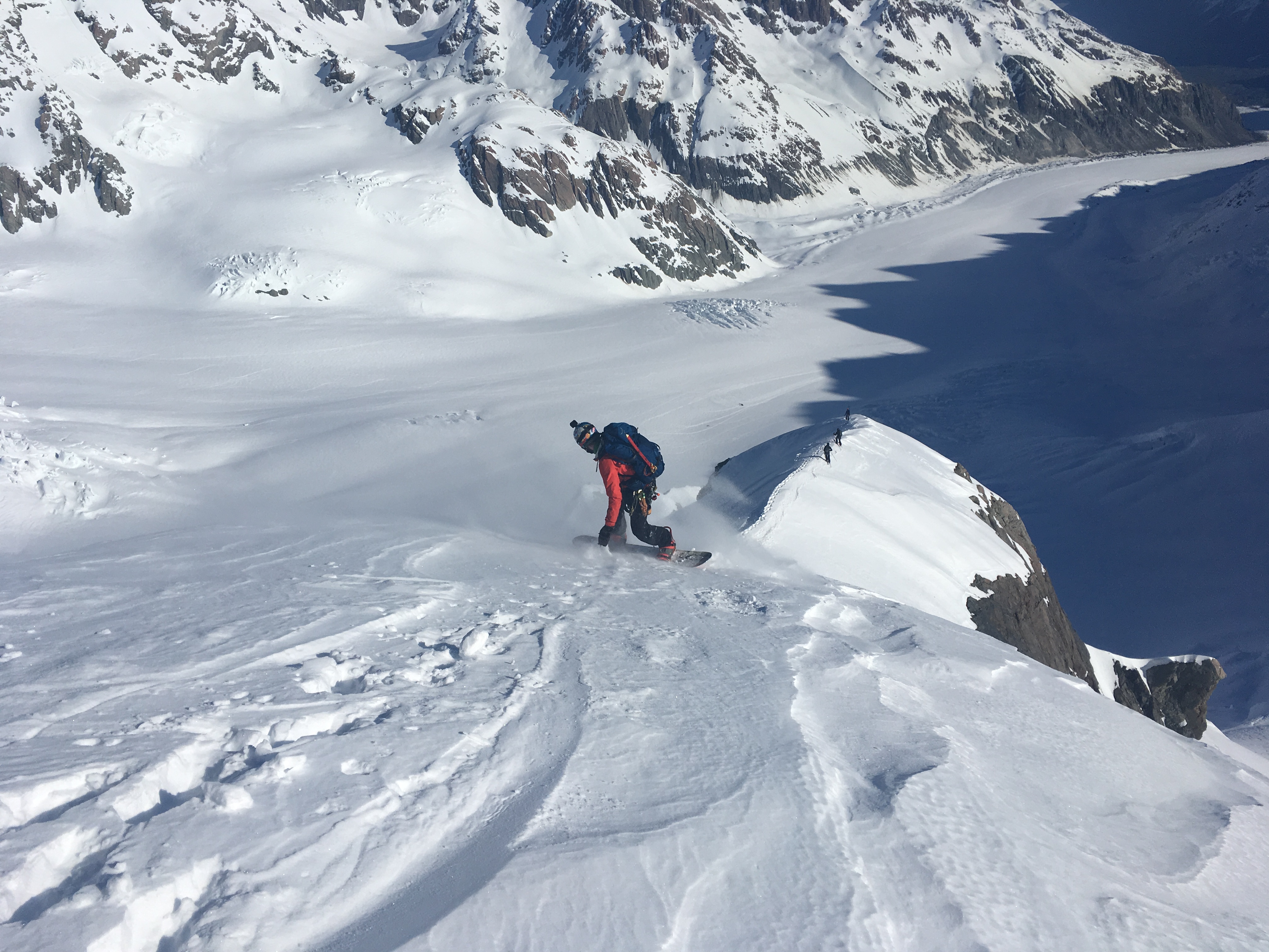 Cruise down the summit ridge to your chosen drop in point. Scope out where the best snow is on the climb to decide where your going to ski. As above, the line is more serious and consequential on the West side of the face. Send the shrund and cruise down to the plateau. From here its a fun ski down the apex of the ridge – its easy ground but tres exposed.