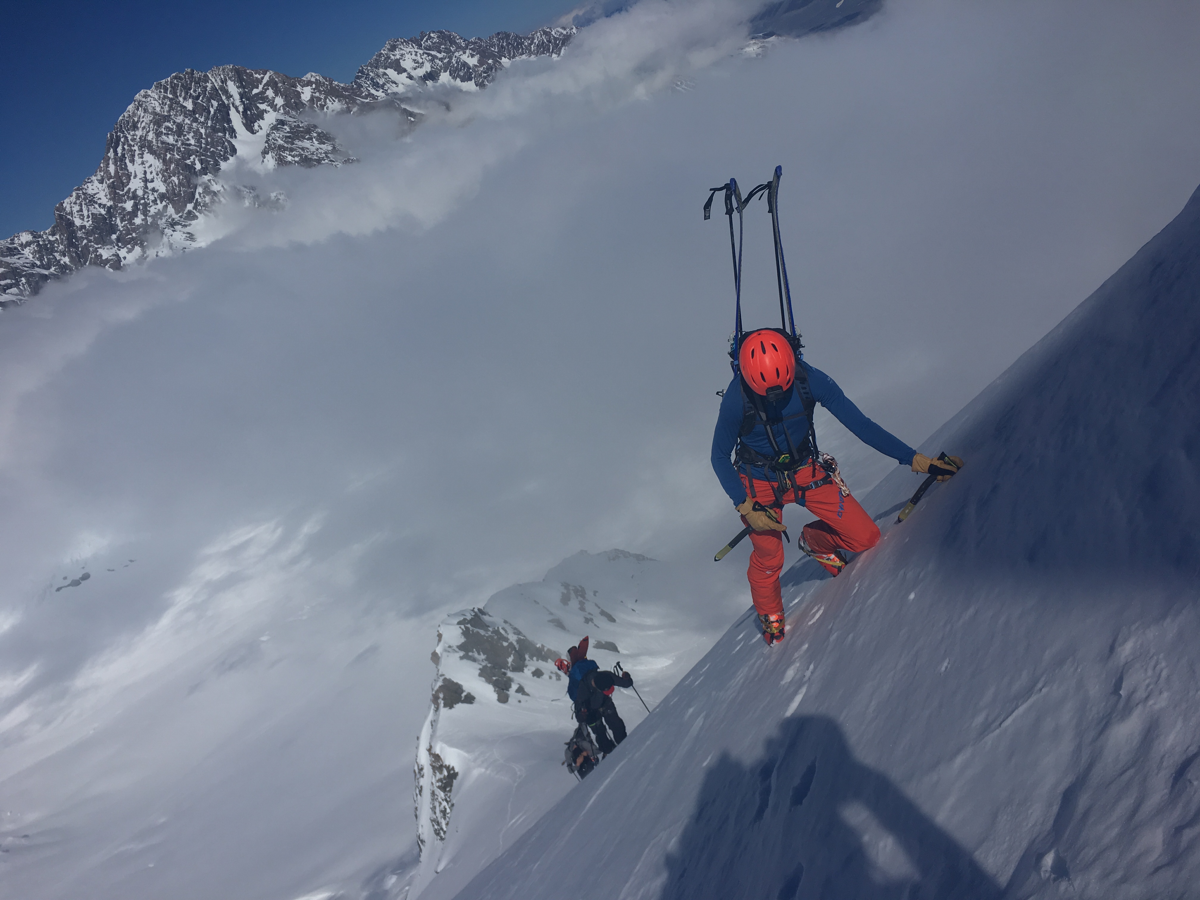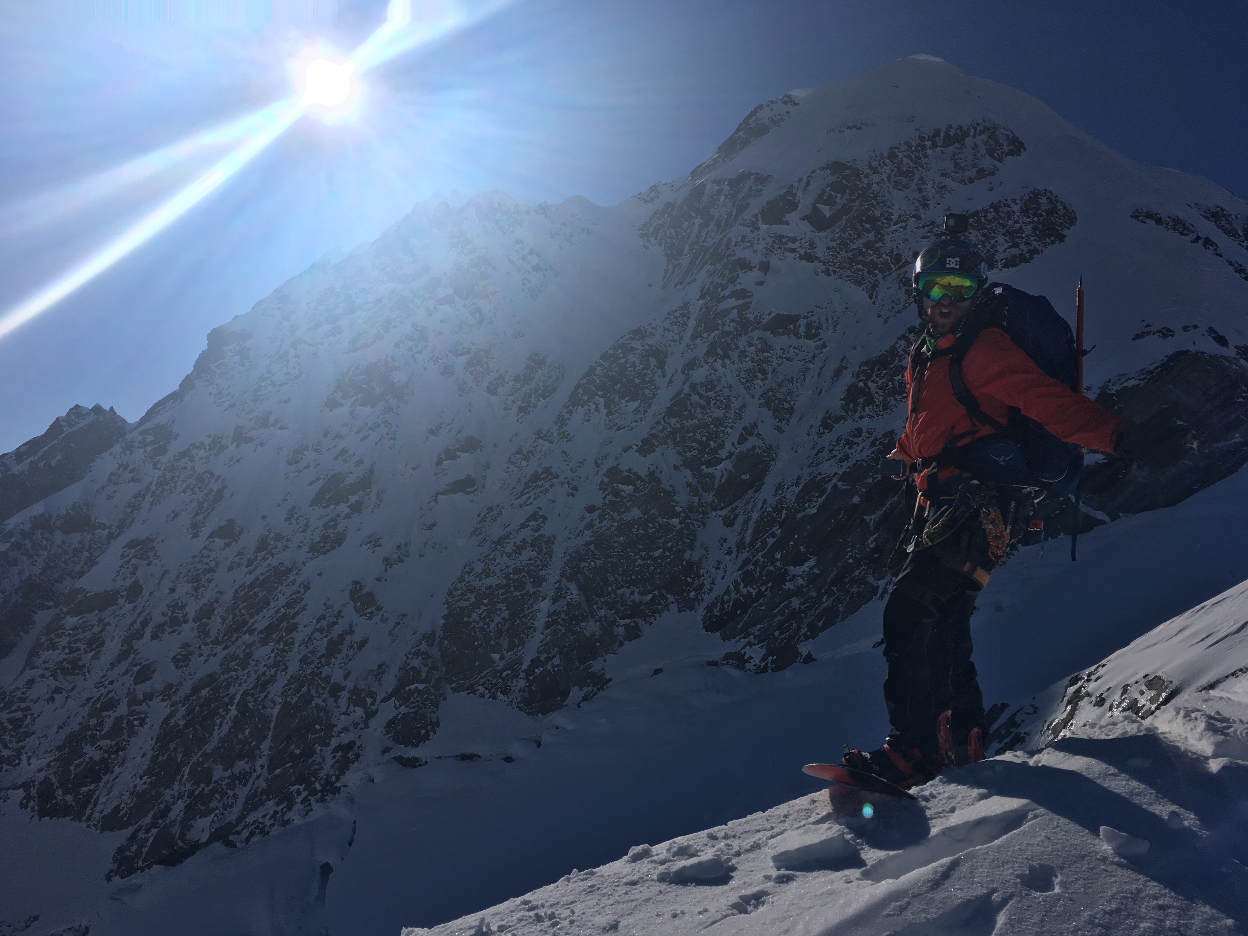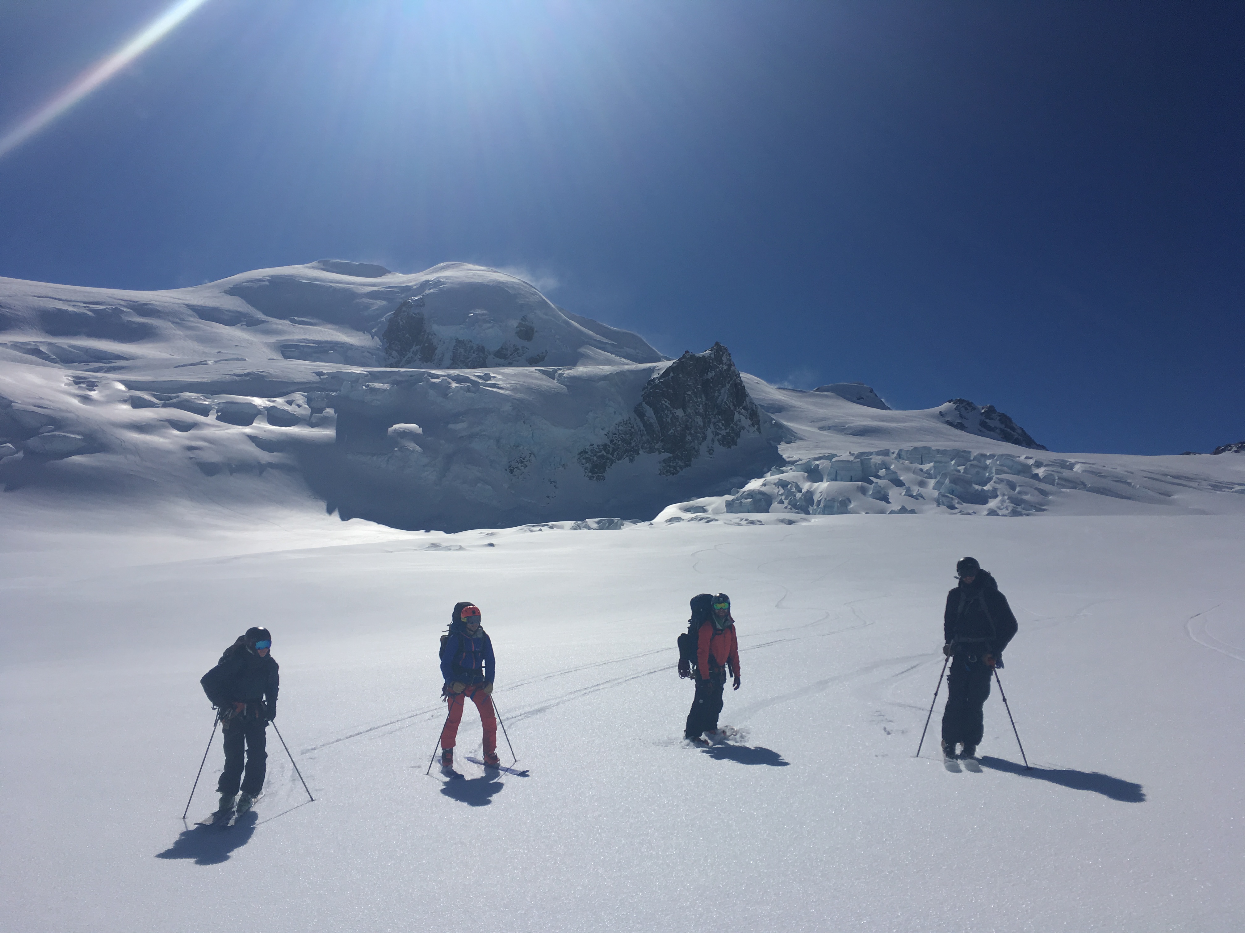 Cruise down the summit ridge to your chosen drop in point. Scope out where the best snow is on the climb to decide where your going to ski. As above, the line is more serious and consequential on the West side of the face. Send the shrund and cruise down to the plateau. From here its a fun ski down the apex of the ridge – its easy ground but tres exposed.