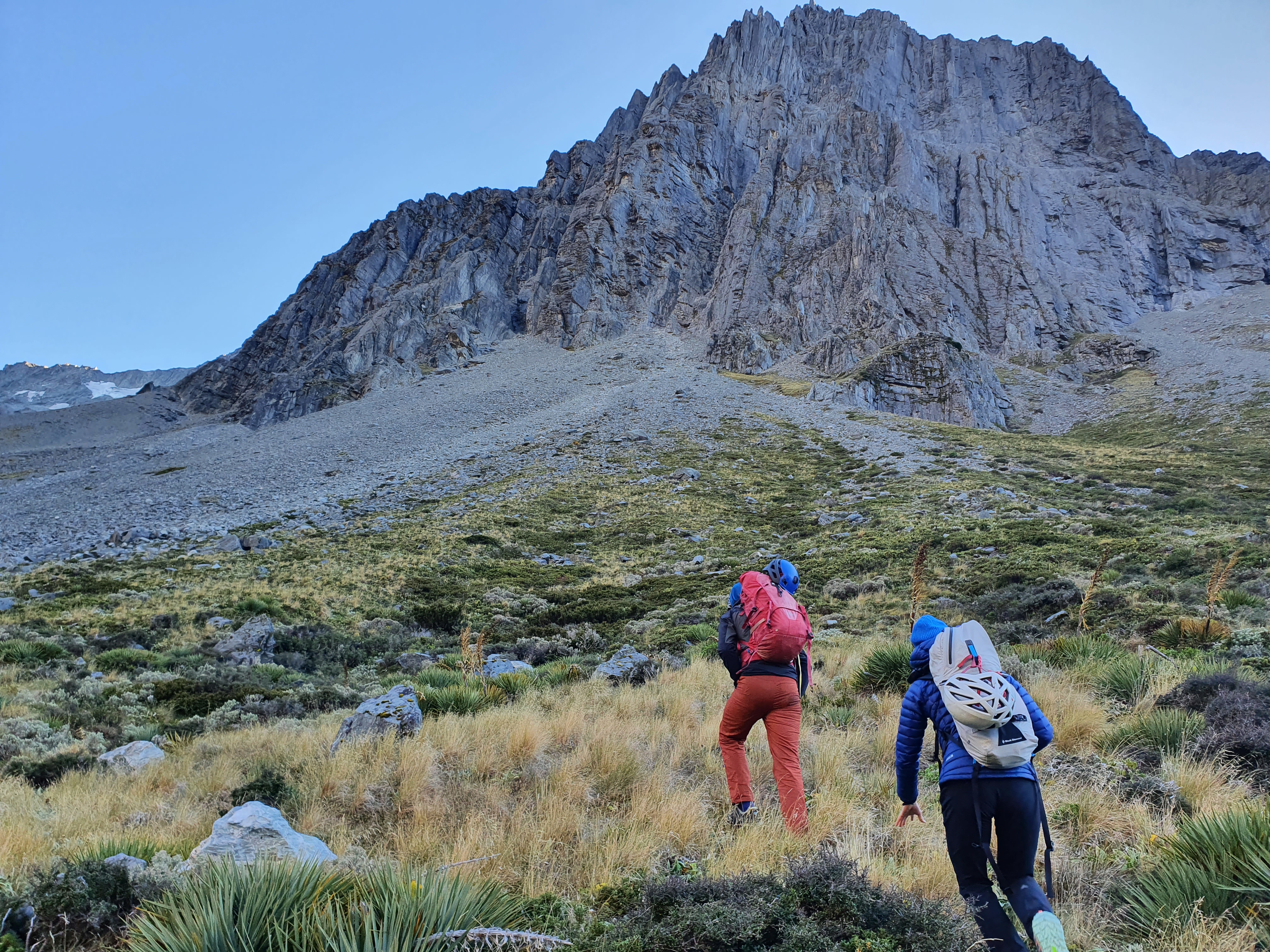 If hiking in, park up in the lay by just south of the bridge at the end of Bush stream. The track is initially fairly well trodden but after a km or two you’re rock hopping up the river bed, crossing multiple times. It’s uneven ground but fairly easy going, and no bush bashing is required. The climbing line is super obvious as you come up the valley, dominating the skyline on the northern side. As you get to the upper valley under the route the river bed flattens up and you can cruise up scree slopes to the base of the route. It should take around 3.5 hours to get to the base of the route from the car (it would be pretty difficult in the dark though). The alternative (and what we opted for due to only a short time window) was to fly in from Glentanner airport and then walk out. A flight was $580 so pretty affordable between 3, and the 08:30 had us at the base of the route and climbing by 09:30.