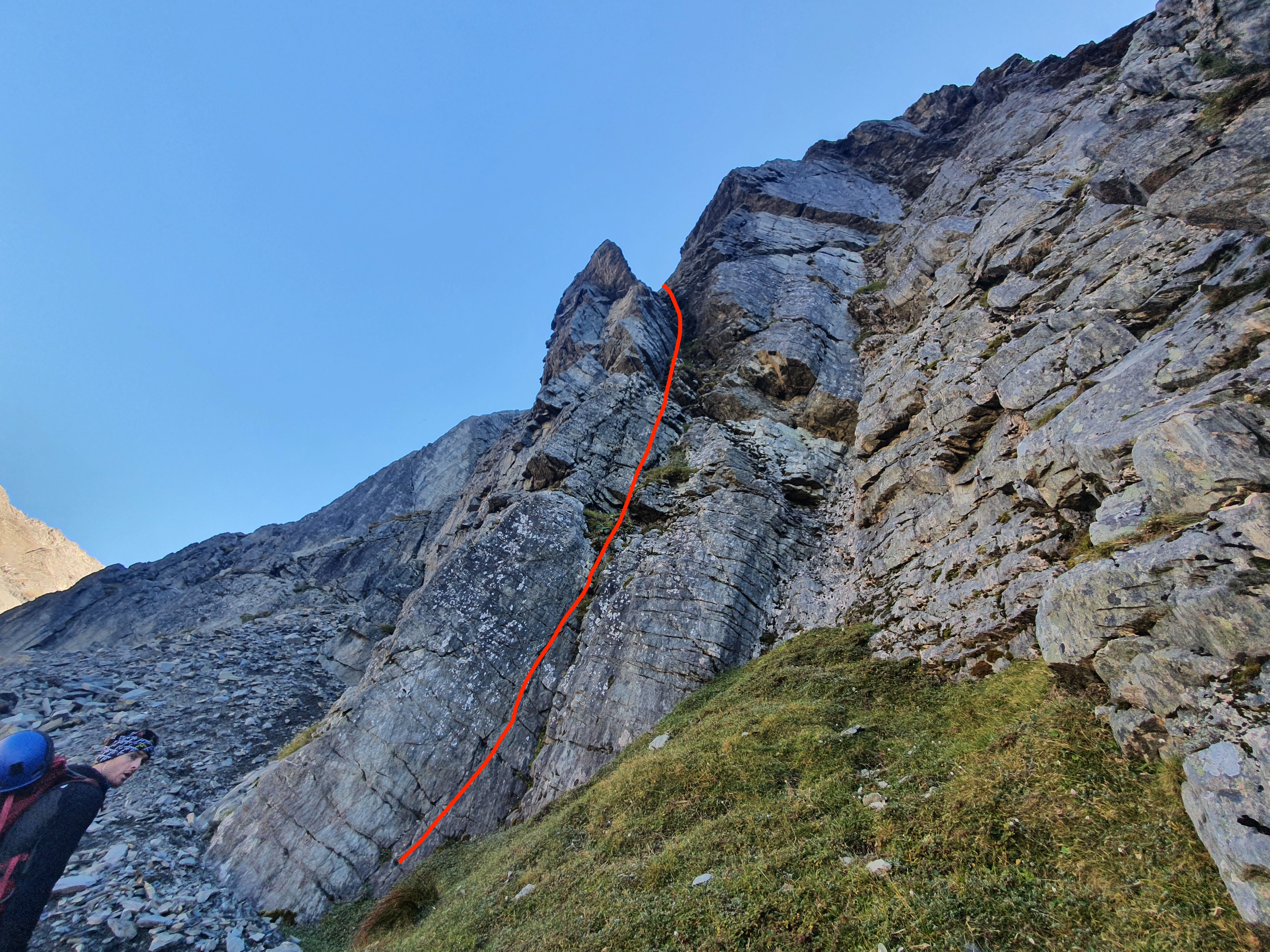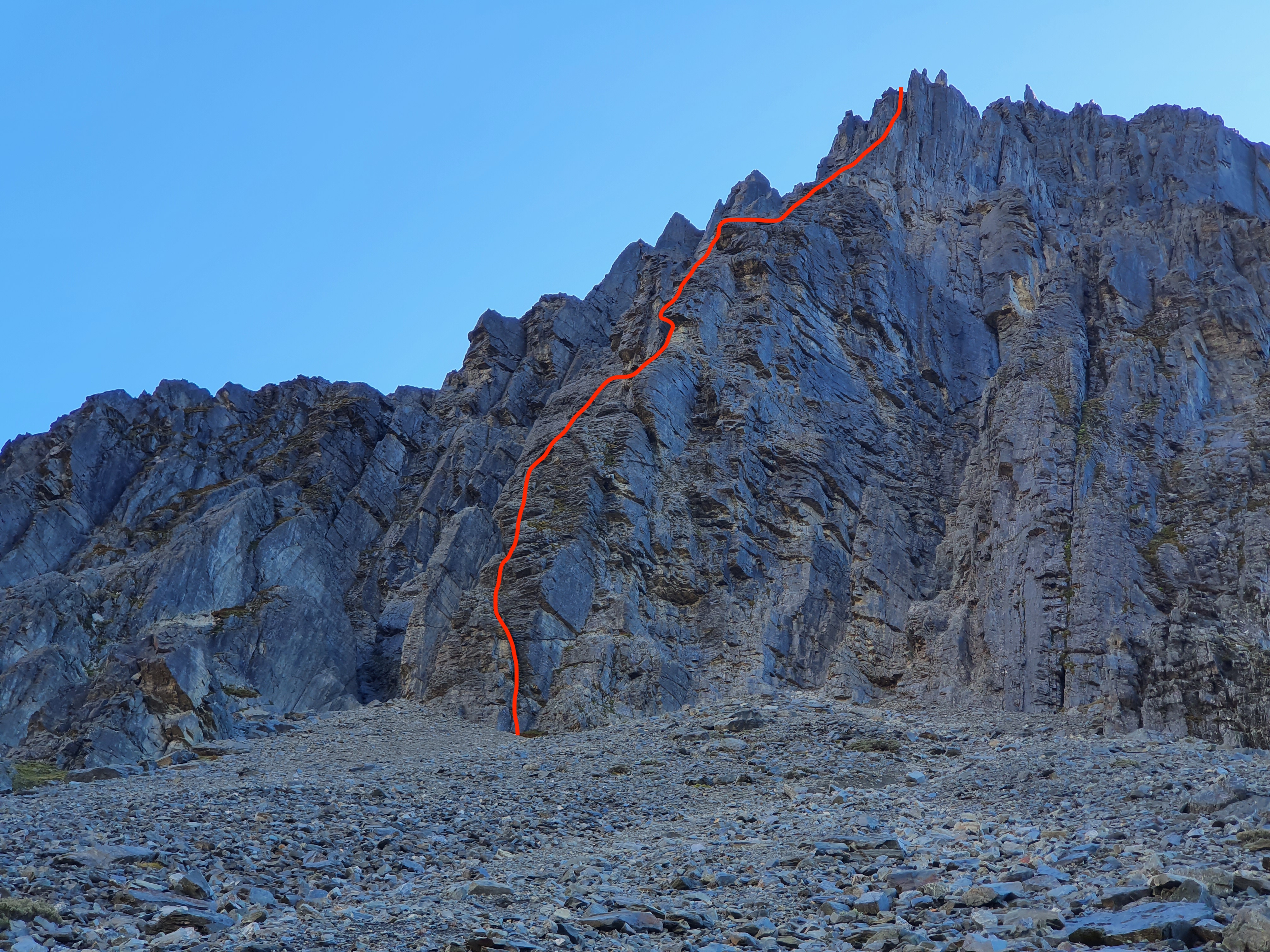 Carrying on to the very top looks like it would involve 2 more pitches of climbing (beyond the Red Cross in the above picture) and then a good few hundred metres of walking up through scree fields.