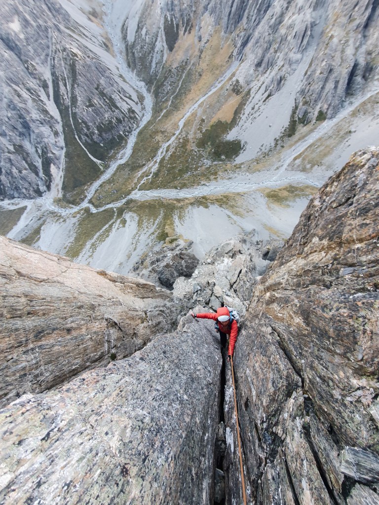 A 550m grade 19 trad route on solid rock with varied interesting climbing, just a 3 hour hike from the Mount Cook Road. This route wasnโt really on our radar until Will suggested it, but turned out to be the best multi-pitch route we’ve climbed outside the Darrans. Better than Sabre peak!