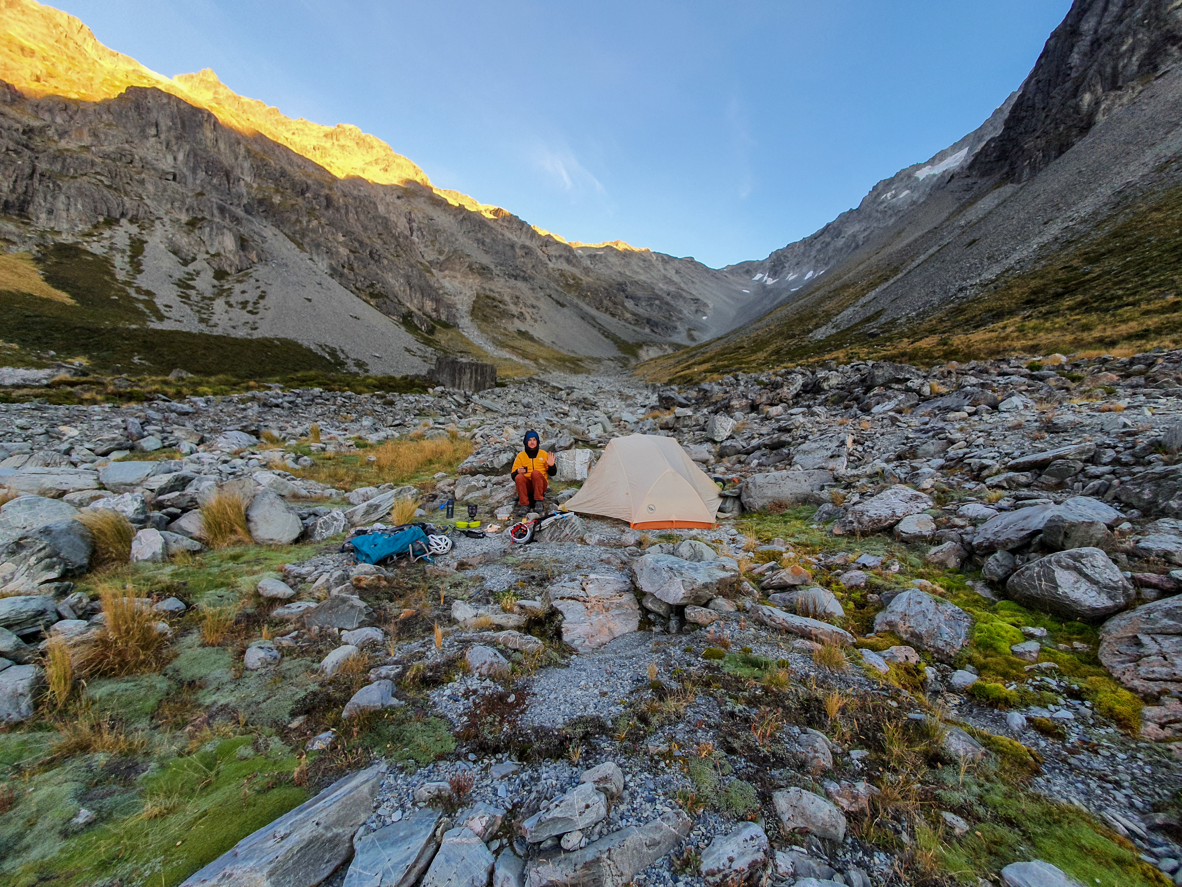 Doing the route in April meant the days were short and by the time we got back down to the valley it was fully dark. Thankfully we had left a GPS dot on our camping gear or we would never have found it after burying it under rocks for Kea protection. The whole river bed is covered in good bivvy spots, or if you cross to the south side of the river near the big boulders there are some even bigger spots.