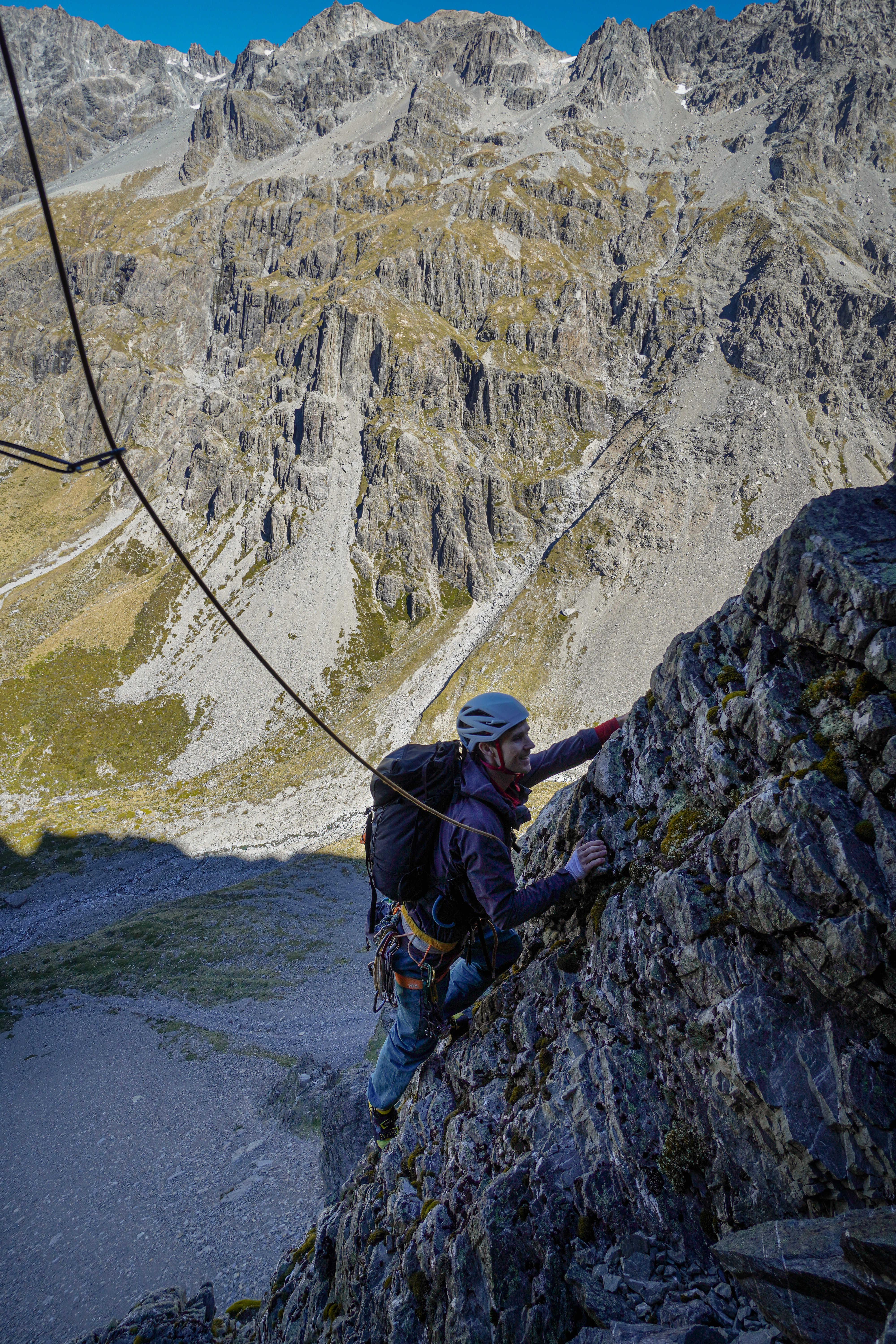 Pitch 3: (17 40m) Head up and right from the belay to the top of the arete. From the flat platform step right onto the steep wall hanging out over the edge and traverse up and round to the right. Mega exposure! Big jugs and good gear. Once you’re up over this section the angle eases off. Aim for the right hand side of the ridge to make your belay.