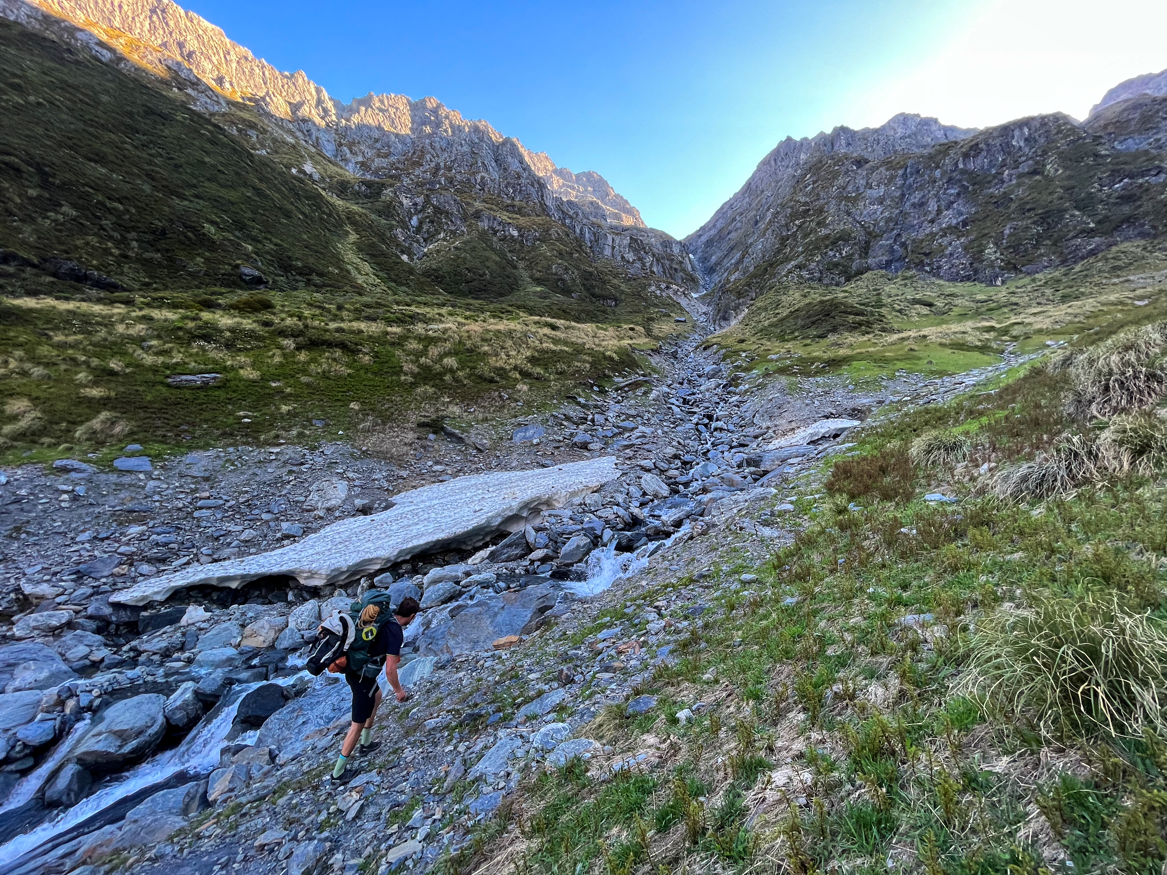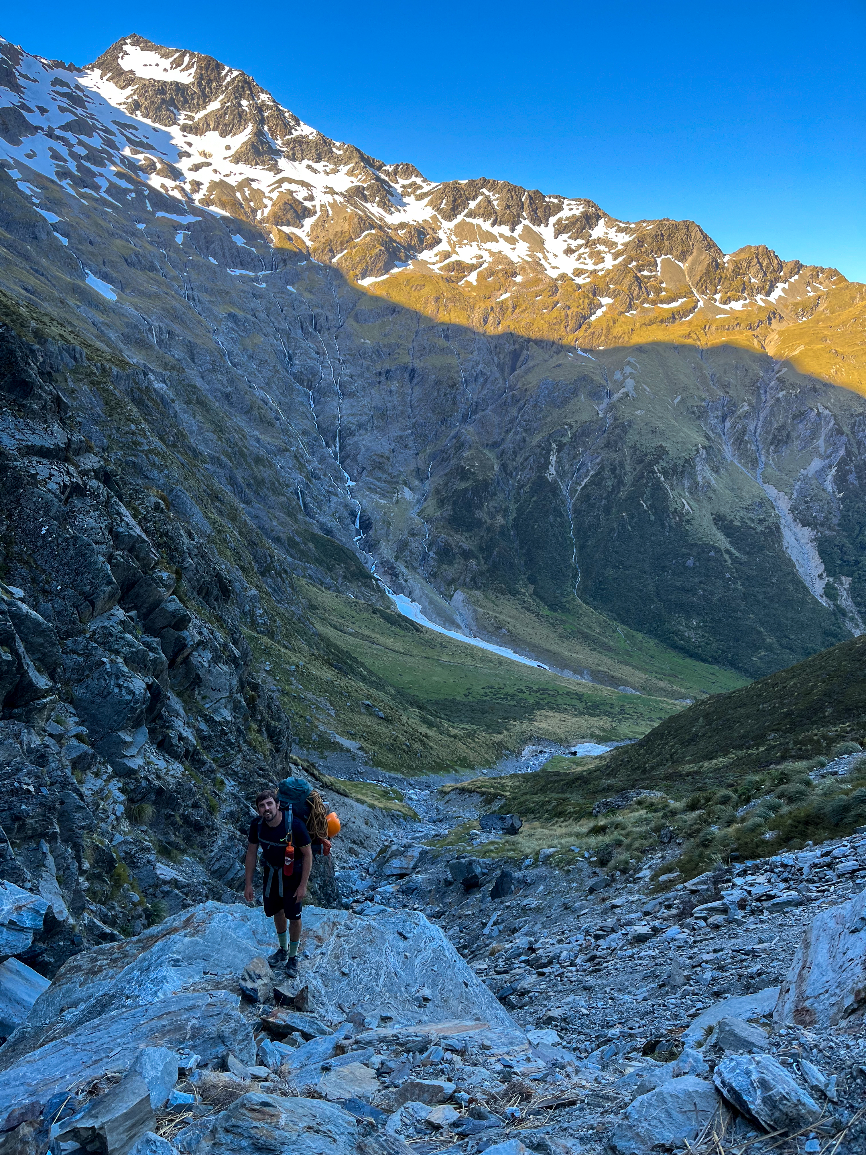 Option 1: Walk in/out via N Temple Track. 1.5h along a doc trail – a few landslides along the way make for navigating some fallen trees. Getting up and over Gunsight Pass to the biv spot took 4-5h. I would not want to descend this chossfest, so would not recommend this as a way out.