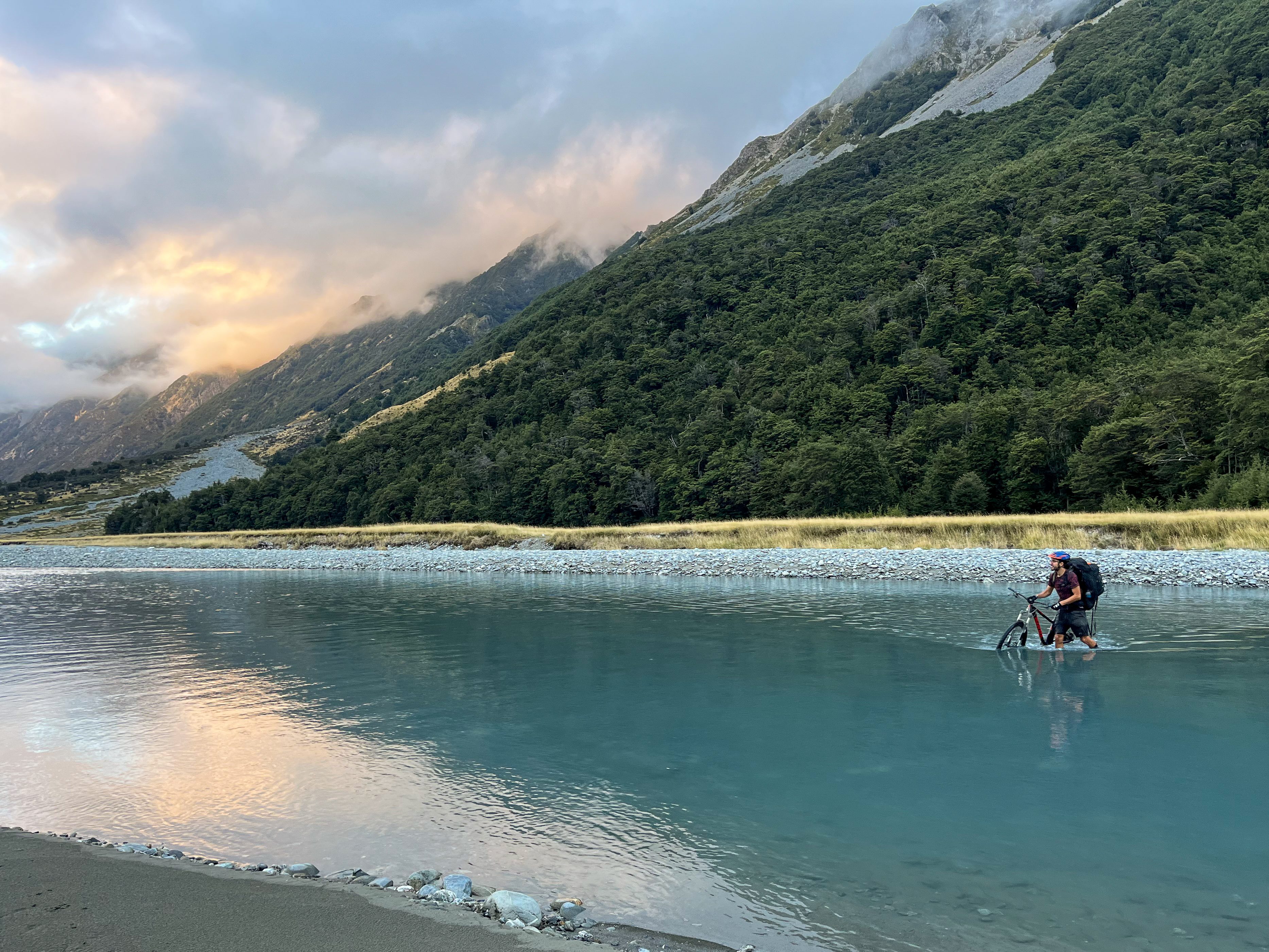 From Monument Hut, don’t follow the trail into the forest – it is possible to bike but the track makes you gain elevation unnecessarily. Instead cross the river immediately in front of the hut (1st of many crossings so don’t be precious about your feet). There are a few 4WD tracks – one that takes you up the river’s true right then cuts across to Red Hut; the other goes diagonally across towards Red Hut on the river’s true left. The track up the river’s true right was better formed and easier to ride.