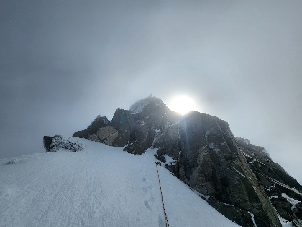 The summit is a knife edge ridge that extends towards a large block at the far climbers right side of the face, which is the true summit. The topos mostly show the route aiming up to the far climbers left of the face which is the route we took – this is a bit awkward as making a belay on the ridge is not the easiest. Genuine knife edge ridge with a lot of exposure on both sides, and the sun is blasting the other side of the ridge so going down there to make a belay wasn’t going to work for us. The top of the south face also catches sun so the snow / ice quality if pretty poor here – we made a 2x picket anchor just below the ridge, but there was a bit of messing around from me going up and down figuring out where best to make the anchor which wasted a bit of time. We then chevalled across the ridge to the true summit where theres a good belay rock you can sling. If we were doing the route again, on the final pitches would just trend climbers right to just top out at the block / true summit and avoid the messing around on the ridge.